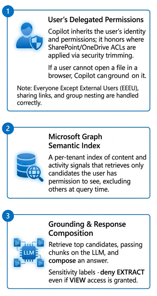 3. Grounding and response composition: Copilot retrieves top candidates, passes relevant chunks to the LLM as grounding context, and composes an answer. If a document carries a sensitivity label with usage rights that deny EXTRACT, Copilot will not include its content in the composed answer even if the user has VIEW access.