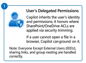 1. The user’s delegated permissions: Copilot inherits the identity of the prompting user and honors SharePoint/OneDrive ACLs via security trimming. If the user cannot open the file in a browser, Copilot cannot ground on it. This is the single most important control — and the single most overstated one, because “cannot open” is a lower bar than most organizations realize once you count Everyone Except External Users (EEEU), broad-scope sharing links, group nesting, and site-level membership that accumulated during a decade of cross-team R&D collaboration.